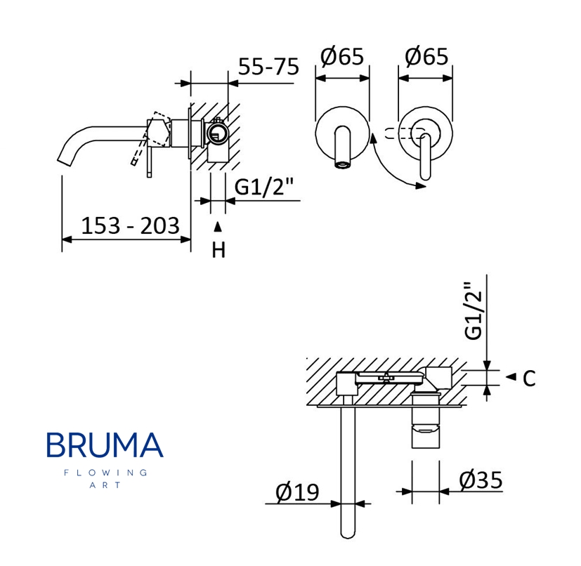 BRUMA X-ALPHA MONOMANDO LAVABO MURAL 20cm