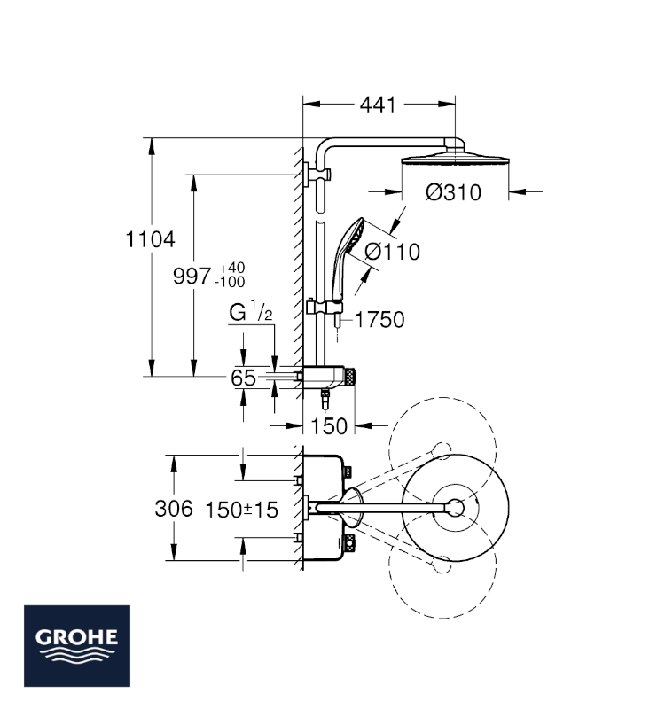 - DUCHA MURAL RAINSHOWER 310 SMARTACTIVE, CABEZAL CROMADO CHORROS GROHE PURE RAIN Y CONCENTRADO JET AL CENTRO DEL CABEZAL