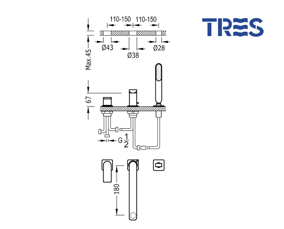 · Caño de bañera de 180 mm. Caudal: 3 bar - 16 l/min.