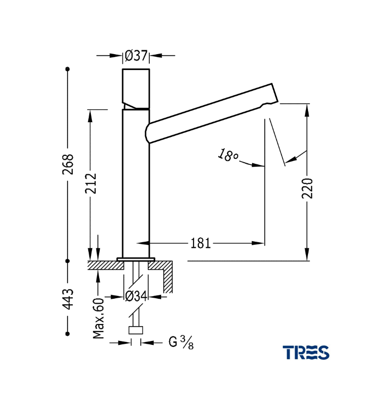 MONOMANDO LAVABO CAÑO LARGO MAX-TRES TRES GRIFERIA Ref. 06120601