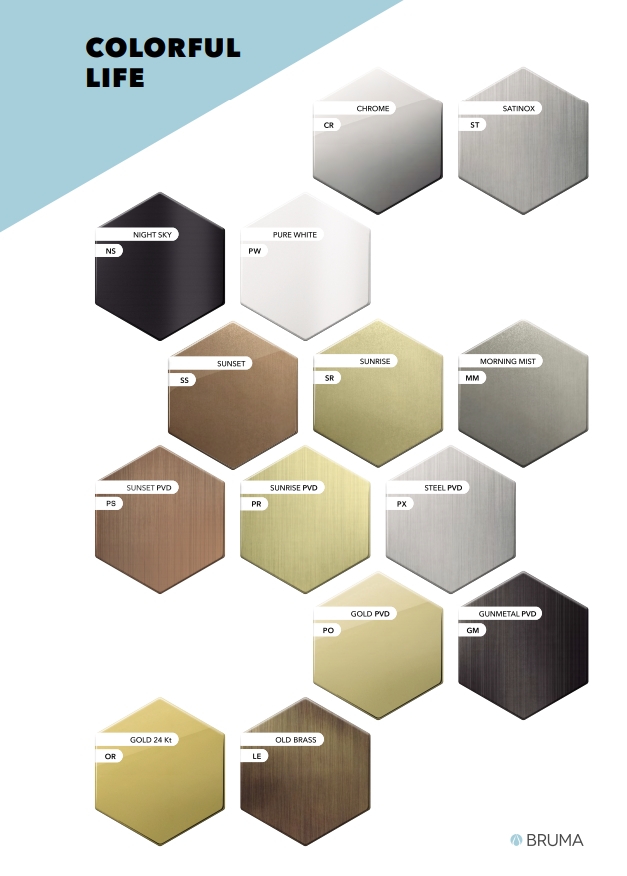 ACABADOS en CROMO, NEGRO MATE, BLANCO MATE, MORNING MIST, SUNRISE y SUNSET