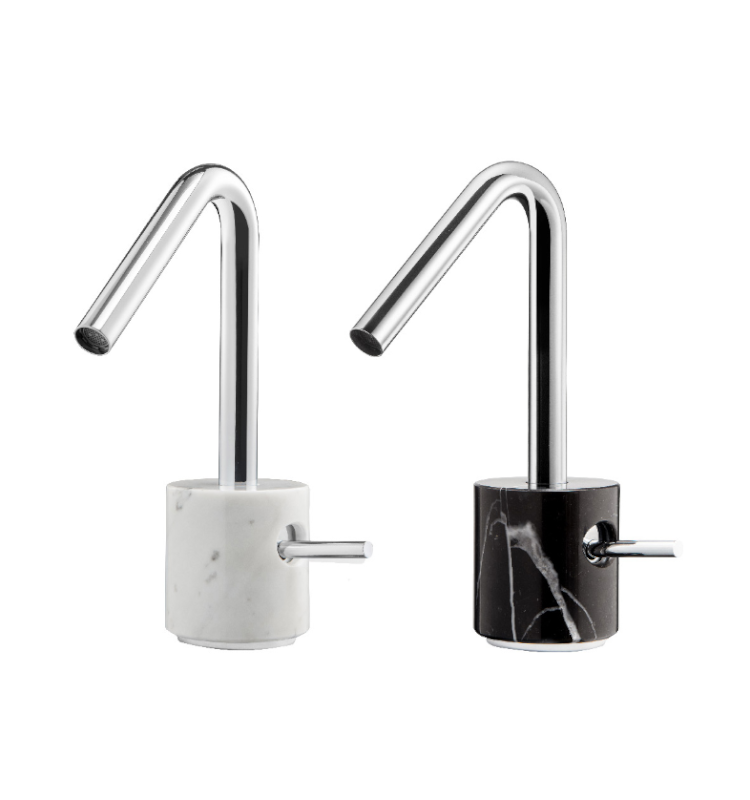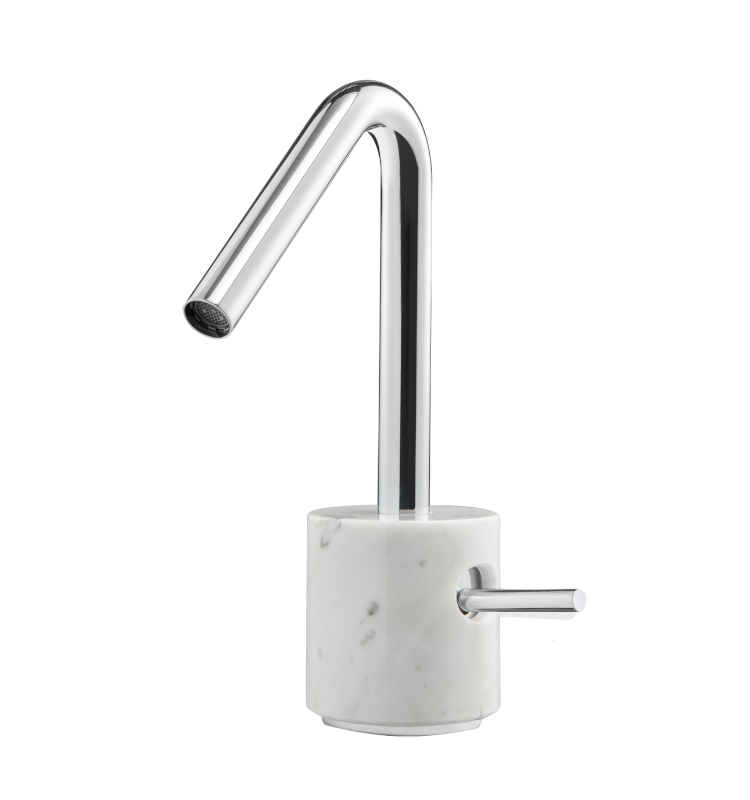 Grifo fabricado en mármol natural y en latón con acabado cromado.
