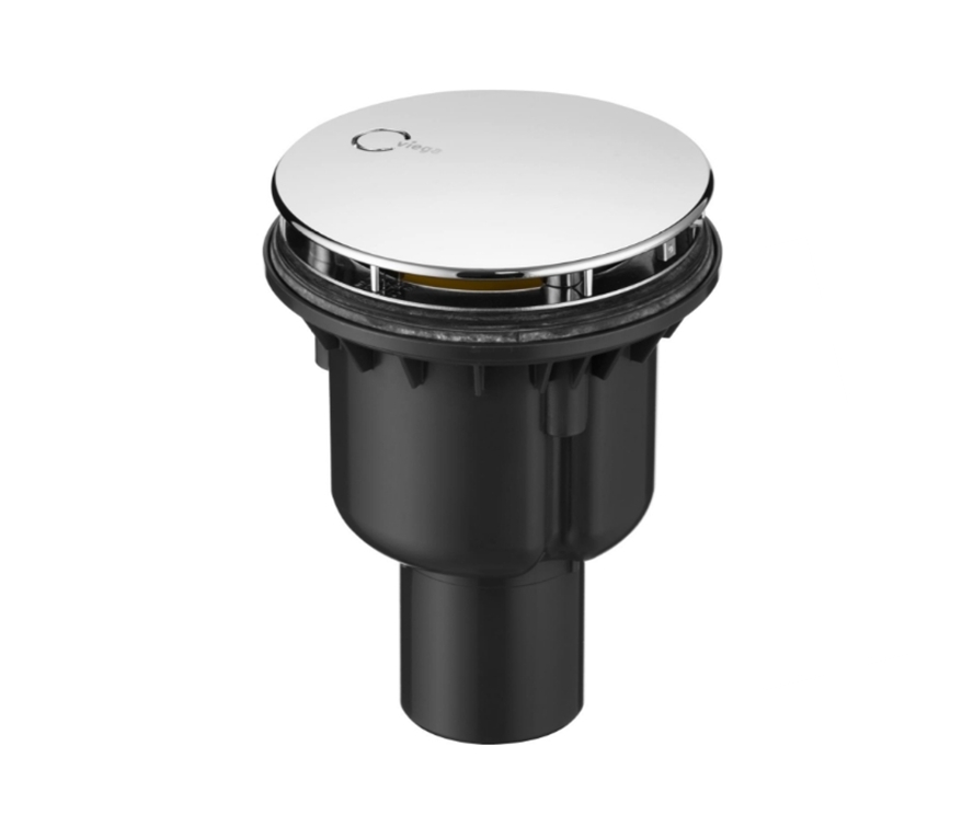 Tapa protectora cromada, sifón extraíble, tubo de salida vertical, orificio mínimo del núcleo Ø 120 mm