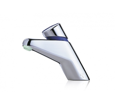 Grifo temporizado ecológico de un agua para instalación sobre repisa con cuerpo de latón cromado.