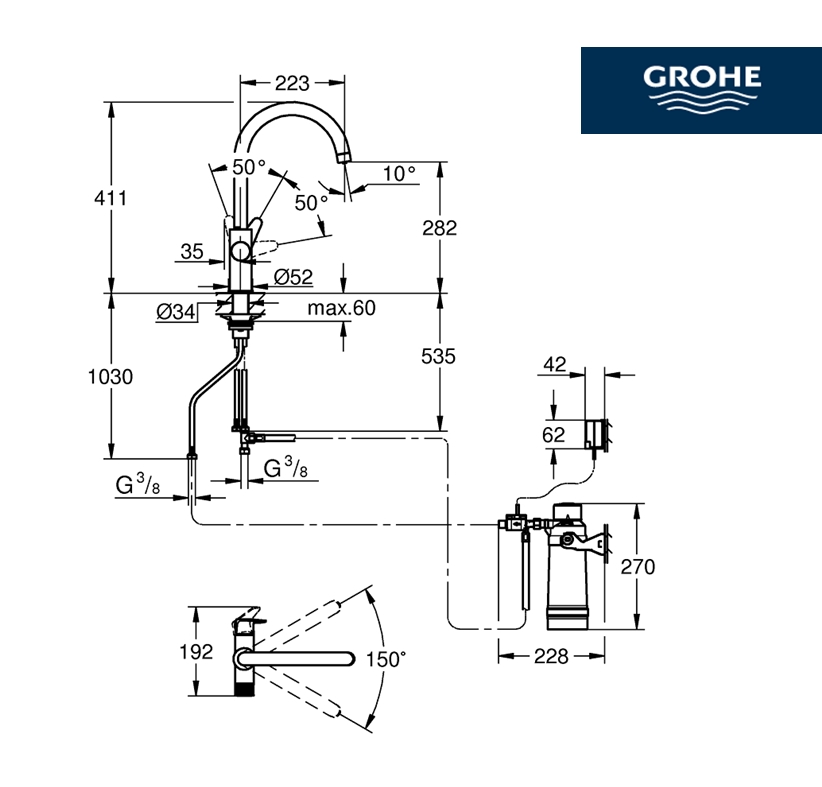 MONOMANDO COCINA STARTER KIT BLUE PURE BAUCURVE GROHE